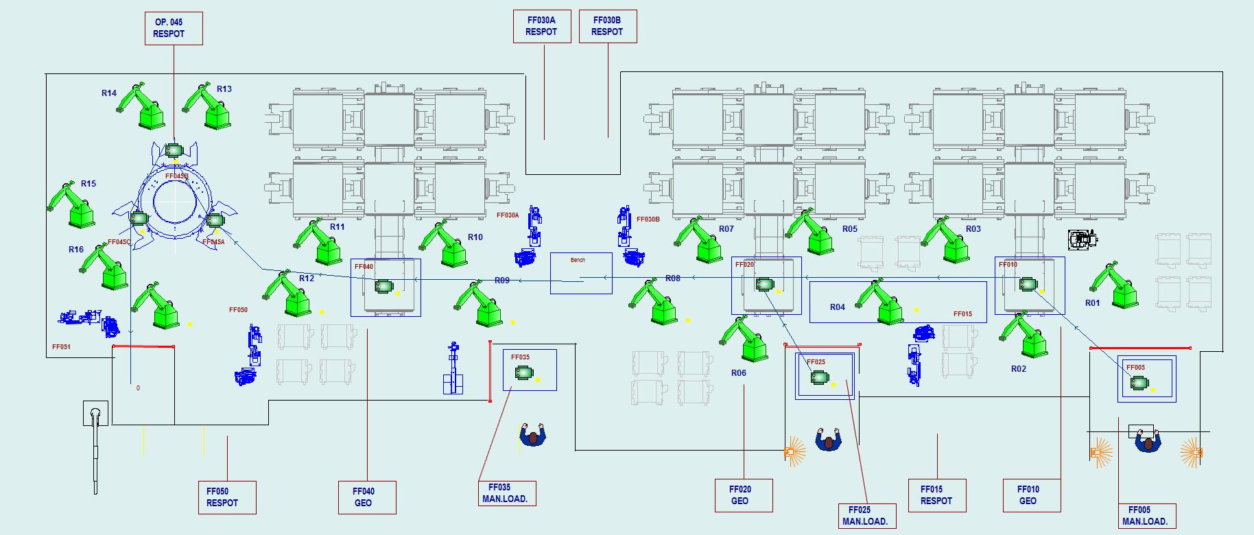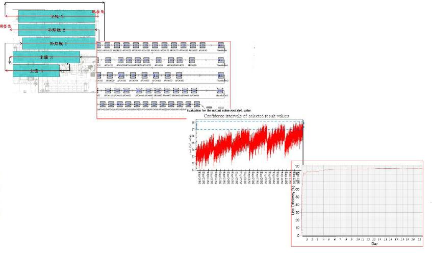 Plant Simulation software was used to model and simulate the production line,adjust the BUFFER capacity or process bottleneck analysis, so as to achieve the opening rate and stable beat of the production line.